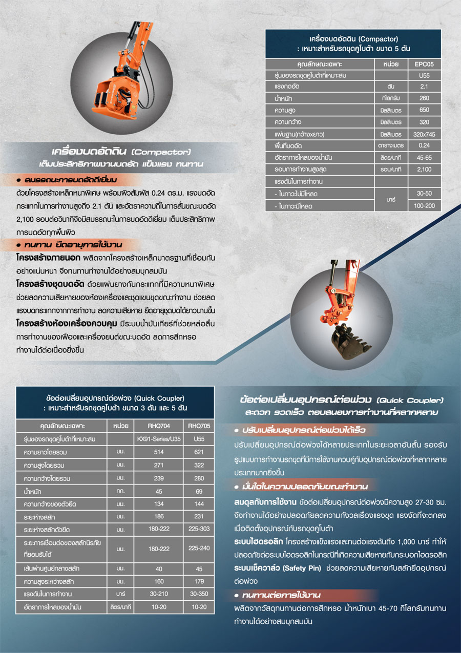ดาวน์โหลดโบรชัวร์ หัวเจาะไฮดรอลิค, เครื่องบดอัดดิน, ข้อต่อเปลี่ยนอุปกรณ์ต่อพ่วง